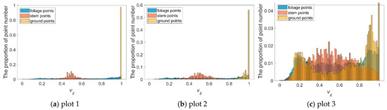 vz of stems are distributed in significantly different intervals from the other two types of objects, while the normal vector distribution of three objects is relatively divergent in plot 3, and there is a similar point number of three objects under the same interval (