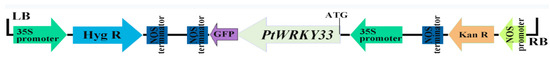 PCR assays were performed to select clones with positive insertions, and the plant expression vector pGWB18-PtWRKY33, containing a CaM35S promoter and NOS terminator, was constructed by seamlessly cloning the DNA from the correct plasmid (confirmed by sequencing) into the pGWB18 vector via the Gateway system.