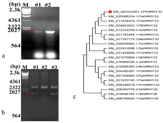 Cloning and phylogenetic analysis of the PtWRKY33 gene in Populus trichocarpa. (a) Electrophoresis of PCR amplification products of full-length DNA of the PtWRKY33 gene; (b) Double digestion to identify the successful construction of pMD18-T-PtWRKY33; (c) Phylogenetic evolutionary tree of amino acid sequences of PtWRKY33 and WRKY33 transcription factors from other species. Note, Figure 2a: M is the HindIII cleavage of λDNA standard, and lanes #1 and #2 are PCR amplification products of the PtWRKY33 gene from the leaves and roots of Populus trichocarpa, respectively; Figure 2b: M is the HindIII cleavage of λDNA standard, and T-#1, T-#2 and T-#3 are the pMD18-T-PtWRKY33 gene identified by double cleavage of the plasmid DNA of Populus trichocarpa ligated into the pMD18-T vector; Figure 2c: Populus trichocarpa, PtWRKY33; Populus alba, PaWRKY33; Populus euphratica, PeWRKY33; Populus trichocarpa, PtWRKY24; Jatropha curcas, JcWRKY33; Hevea brasiliensis, HbWRKY33; Manihot esculenta, MeWRKY33; Tripterygium wilfordii, TwWRKY33; Durio zibethinus, DbWRKY33; Pistacia vera, PvWRKY33; Quercus fabri, QlWRKY33; Juglans regia, JrWRKY33; Morus notabilis, MnWRKY33; MnWRKY33; Prunus dulcis, PdWRKY33; Prunus persica, PpWRKY33; Prunus avium, PavWRKY33; Prunus mume, PmWRKY33; Solanum tuberosum, StWRKY26; Nicotiana tabacum, NtWRKY26; Nicotiana sylvestris, NsWRKY26.