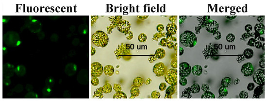 The observation of pressed slices of transformed Arabidopsis protoplasts under a Caius fluorescence microscope (Olympus) revealed that the 35S-PtWRKY33-GFP fusion showed green fluorescent protein expression in the nucleus (Figure 3), demonstrating the nuclear localization of the PtWRKY33-GFP fusion protein, which is consistent with the above PSORT and Plant-mPLoc software that predicted subcellular localization to the nucleus. These results indicate that the PtWRKY33 transcriptional protein plays a transcriptional regulatory role in the nucleus.