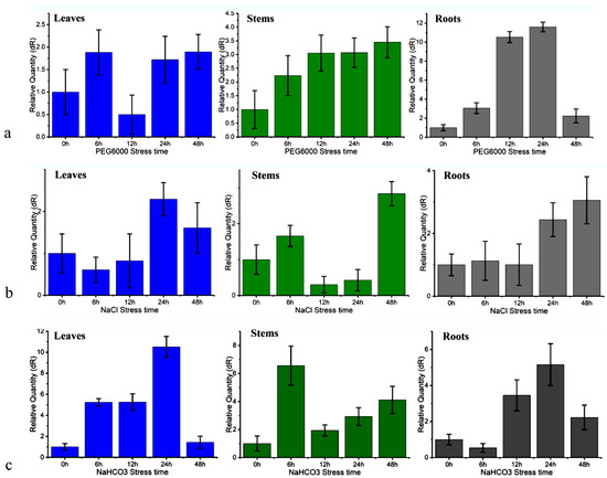 Expression characteristics of PtWRKY33 under PEG, NaCl, NaHCO3 stress. (a) PtWRKY33 expression after treatment with 20% PEG6000 for 0, 6, 12, 24 and 48 h; (b) PtWRKY33 expression after treatment with 150 mM NaCl for 0, 6, 12, 24 and 48 h; (c) PtWRKY33 expression after treatment with 60 mM NaHCO3 for 0, 6, 12, 24 and 48 h, respectively.