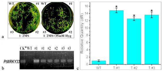 Molecular detection of transgenic tobacco with the PtWRKY33 gene. (a) Germination of T3 transgenic tobacco lines with the PtWRKY33 gene and resistance to hygromycin; (b) PCR confirming genomic integration in T3 transgenic tobacco lines with the PtWRKY33 gene; (c) Gene expression of the PtWRKY33 transgenic line under the 35S promoter. * The difference was significant at the p < 0.05.