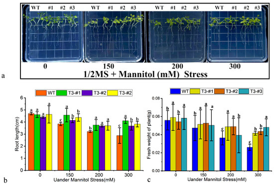 Drought resistance of PtWRKY33-transformed tobacco. (a) Growth phenotypes of transgenic tobacco plants with the PTWRKY33 gene under drought stress simulated by mannitol. The phenotype under the addition of 0, 150, 200 and 300 mM mannitol to 1/2 MS was observed after 14 days; (b) Root growth of transgenic tobacco seedlings overexpressing the PTWRKY33 gene under drought stress simulated by mannitol. The main root length of the plants was measured after incubation on 1/2 MS containing 0, 150, 200 and 300 mM mannitol for 14 days (n = 3, p < 0.05); (c) Fresh weight of transgenic tobacco seedlings overexpressing the PTWRKY33 gene under drought stress simulated by mannitol. The fresh weight of the plants was measured after 14 days of growth under the stress of 0, 150, 200 and 300 mM mannitol in 1/2 MS (n = 3, p < 0.05). (a–c indicate p < 0.05).