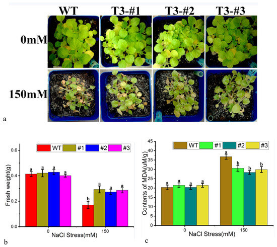 Salt-tolerant (NaCl) growth of tobacco overexpressing PtWRKY33. (a) Plant growth of PtWRKY33-overexpressing and WT plants under 0 mM and 150 mM NaCl stress; (b) The fresh weight of plants overexpressing PtWRKY33 and WT plants under 0 mM or 150 mM NaCl stress; a and b indicate significant differences at the p < 0.05 level; (c) The malondialdehyde (MDA) contents in the leaves of plants overexpressing PtWRKY33 and WT plants under 0 mM or 150 mM NaCl stress; a and b indicate p < 0.05 level.