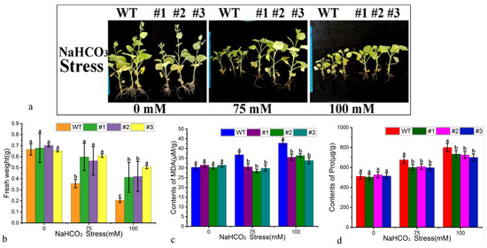 Alkaline salt-tolerant growth of tobacco overexpressing PtWRKY33. (a) Plants overexpressing PtWRKY33 and WT plants were treated with 0 mM, 75 mM and 100 mM NaHCO3; (b) The fresh weight of plants overexpressing PtWRKY33 and WT plants treated with 0 mM, 75 mM and 100 mM NaHCO3 (a–c indicate p < 0.05); (c) Under the stress of 0 mM, 75 mM and 100 mM NaHCO3, the malondialdehyde (MDA) contents in the leaves of tobacco plants overexpressing PtWRKY33 and WT tobacco leaves were measured (a–c indicate p < 0.05); (d) Under the stress of 0 mM, 75 mM and 100 mM NaHCO3, the content of proline in the leaves of tobacco overexpressing PtWRKY33 and WT tobacco leaves was determined (a–c indicate p < 0.05).