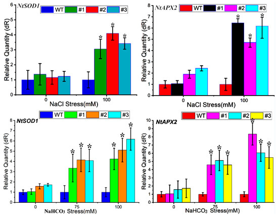 The expression of adversity marker genes (NtCu/Zn-SOD1, NtAPX2) was measured in the leaves of the transgenic lines and WT plants after NaCl and NaHCO3 treatment. RNA was extracted from the top carpels, and reverse-transcribed cDNA was used as the template for the assay. qRT–PCR was performed to measure the expression of the genes, and the method was the same as that described in Section 2.2.3. The quantitative PCR primers are shown in the Supplementary Materials (Table S1).
