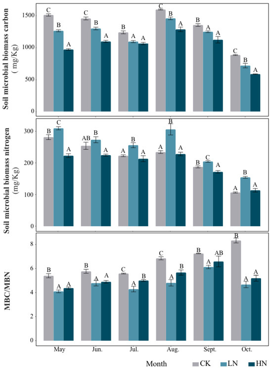 In general, the addition of N reduced microbial biomass carbon (MBC) and carbon/nitrogen ratio (MBC/MBN) (Figure 1). During the whole growing season, the soil MBC decreased significantly with the increase in N application rate. Under LN treatments, MBC decreased by 16.40%, 10.77%, 12.67%, 9.67%, 8.78% and 19.77% compared to CK from May to October, respectively. Under HN treatments, MBC decreased by 35.77%, 24.72%, 14.16%, 19.44%, 17.04% and 33.75% compared to CK from May to October, respectively. The general trend of soil microbial nitrogen (MBN) that was affected by N addition was inhibited under HN treatments and promoted under LN treatments. The addition of N reduced the MBC/MBN ratio during all of the growing seasons.