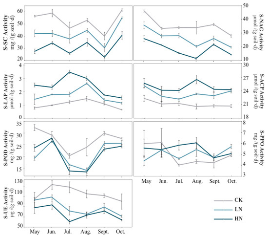 The activities of SC were significantly reduced by N addition (Figure 2). From May to October, the activities of SC decreased by 24.97%, 28.27%, 18.94%, 15.54%, 23.80% and 10.49% compared to the control under LN treatment, respectively. For HN treatment, The activities of SC decreased by 50.93%, 41.51%, 44.05%, 34.14%, 42.77% and 33.75% from May to October, respectively. Under HN treatment, the activities of SC were significantly different from the control (p < 0.05).