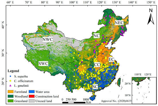 The land use, and land cover, and distribution points of L. gmelinii, S. superba, and C. officinarum in China. EC: East China; NEC: Northeast China; NC: North China; CC: Central China; SC: Southern China; NWC: Northwest China; SWC: Southwest China.