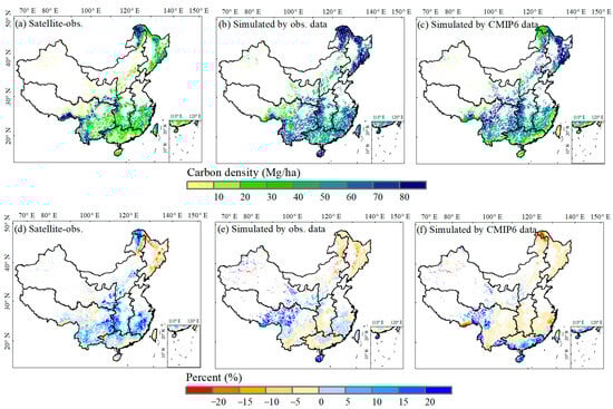 Spatial distribution of the annual mean forest ABC during 1993–2012 and the percentage change in the annual average forest ABC from 2001 to 2012 compared with 1993–2000 in China: (a,d) satellite-observed; (b,e) simulated, driven by observed meteorological data; (c,f) simulated, driven by CMIP6 data.