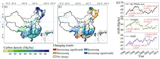Spatial distribution of carbon density (a), changing trends (b), and (c) the annual mean forest ABC during 1982–2014.