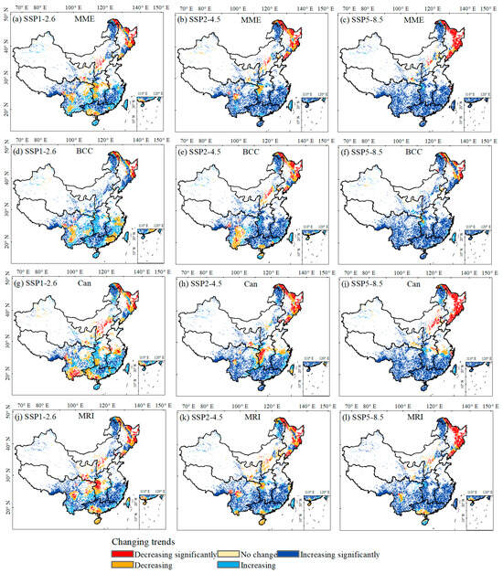 (2) The trajectory of forest ABC in TCBMF is set to undergo a sustained decline with a maximum decline rate of −0.46 Mg/ha/a under the SSP5-8.5 scenario. In stark contrast, the forest ABC in SEBF is anticipated to experience a notable upswing at a rate of 0.13 Mg/ha/a under SSP5-8.5. Under the SSP5-8.5 scenario, the proportion of pixels with significantly increased or decreased forest ABC is higher compared to other scenarios. Among them, the BCC model results will have the highest proportion of pixels with a significantly increasing trend in forest ABC at 80.34%, whereas the Can will have the largest proportion of significantly decreasing forest ABC at 19.63%.