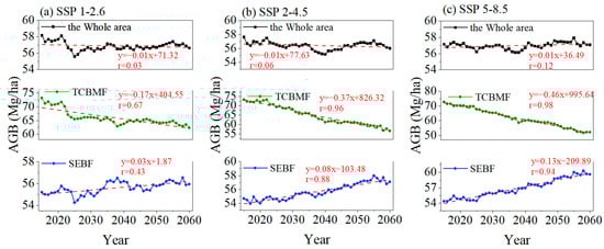 The forest ABC of TCBMF in Northeast China showed a significant downward trend from 1993 to 2012, while the ABC of SEBF in South China showed a continuous upward trend. Combining the LPJ model and GCM data, the future forest ABC indicated a significant overall increase in ABC in SEBF regions under all SSP1-2.6, SSP2-4.5, and SSP5-8.5 conditions from 2015 to 2060, which was consistent with the results obtained by Kong et al. (2022) [2]. This phenomenon would be attributed to the higher precipitation and temperature conditions in SEBF regions, which can meet the requirements for vegetation growth [2]. Liu et al. (2015) [38] believed that tropical deforestation declines in China had also contributed to the increase in forest ABC in the region. Furthermore, the forest ABC in TCBMF of China will experience a continuing significant downward trend from 2015 to 2060. Sun et al. (2022) [39] also obtained similar results regarding the changes in forest carbon stocks in the Northeast region of China using the INVEST model based on land use and land cover changes. The main reasons for these changes are associated with the conversion of forest land to agricultural land and fluctuations in the economic timber forests of the Lesser Khingan Mountains. In addition, common forest pests and diseases in temperate forests, wildfires, and the degradation of old-growth forests may also lead to a decline in the forest’s carbon sequestration potential in this region [38].