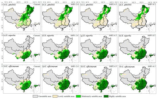 Distribution of current and future potential suitable areas of three typical tree species: (a–d) L. gmelinii; (e–h) S. superba; (i–l) C. officinarum.
