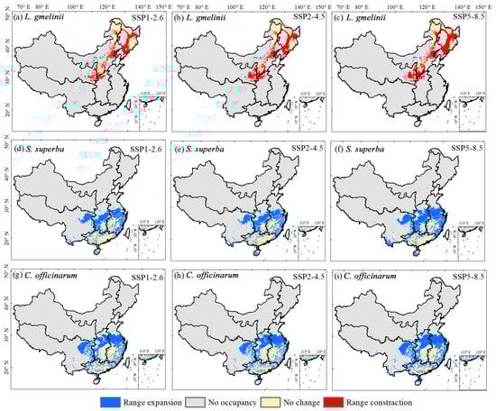 Future changes in the potential geographical distribution of three typical tree species: (a–c) L. gmelinii; (d–f) S. superba; (g–i) C. officinarum.