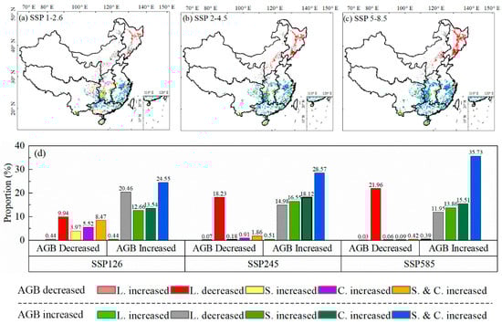 Relationship between ABC and tree species’ suitable area changes under SSP1-2.6 (a), SSP2-4.5 (b), SSP5-8.5 (c), and their area proportion statistics (d); L.: L. gmelinii; S.: S. superba; C.: C. officinarum.