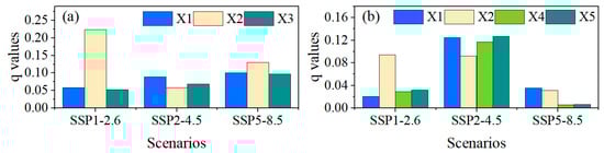 The q values of driving factors for forest ABC variations: (a) TCBMF; (b) SEBF. X1: precipitation; X2: temperature; X3: L. gmelinii; X4: S. superba; X5: C. officinarum.
