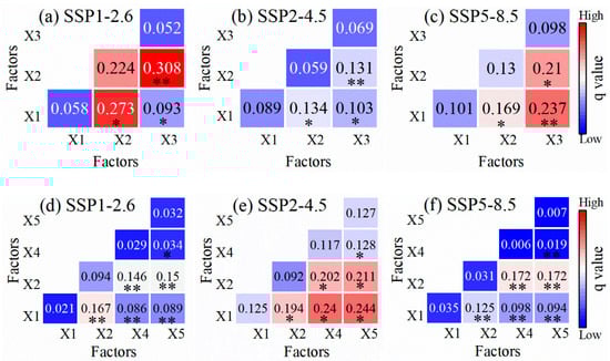 The q values of interaction between factors. Note: * and ** represent the interaction types of bi-variable enhanced and nonlinear-enhanced, respectively. (a–c) TCBMF; (d–f) SEBF. X1: precipitation; X2: temperature; X3: L. gmelinii; X4: S. superba; X5: C. officinarum.