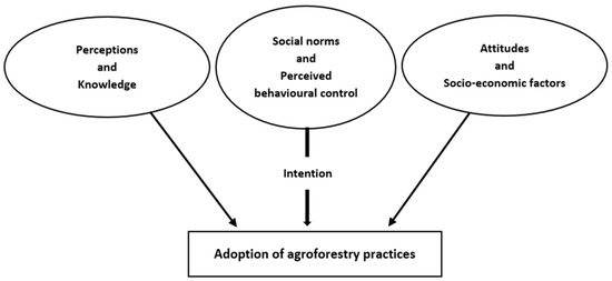 Following [29,34], the framework also incorporates knowledge, perceptions, and socio-economic characteristics to explain the adoption of agroforestry practices. According to [34], knowledgeable individuals are more confident in adopting new technologies. Individuals’ adoption decisions are also influenced by their perceptions of the advantages and disadvantages of agroforestry practices. Moreover, understanding the agroforestry adoption process also requires an analysis of socio-economic factors [29].