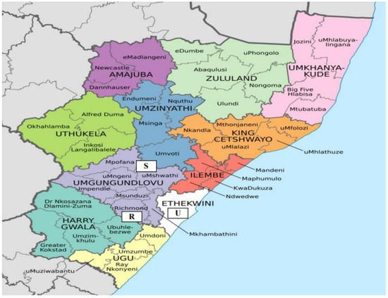 Map showing the KwaZulu-Natal province (Source: [17]). Note: R, S, and U represent Richmond, Swayimane, and Umbumbulu, respectively.