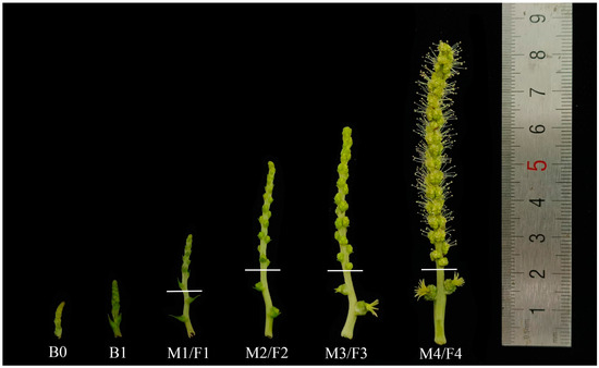 Catkins of C. mollissima ‘Tanqiao’ were collected from the second and higher bearing branches from April to late May between 2019 and 2021 at the Changsha chestnut germplasm resources garden (29°2′5″ N, 110°14′18″ E) in Changsha City, Hunan Province, China [23]. The mixed catkins were harvested from eight-year-old C. mollissima ‘Tanqiao’. We selected six stages with differences in appearance of the mixed catkins collected, with the first two stages named B0 and B1. For the last four stages, the male and female flowers had differentiated on the mixed catkins, so we separated the male flowers from the upper end of the mixed catkins and named them M1, M2, M3, and M4. The female flowers were separated from the lower end of the mixed catkins and were named F1, F2, F3, and F4 (Figure 1). Parts of the collected catkin samples were used for cytological observations. The other samples were placed in liquid nitrogen and then kept at −80 ℃ for the determination of endogenous hormone content and RNA extraction.