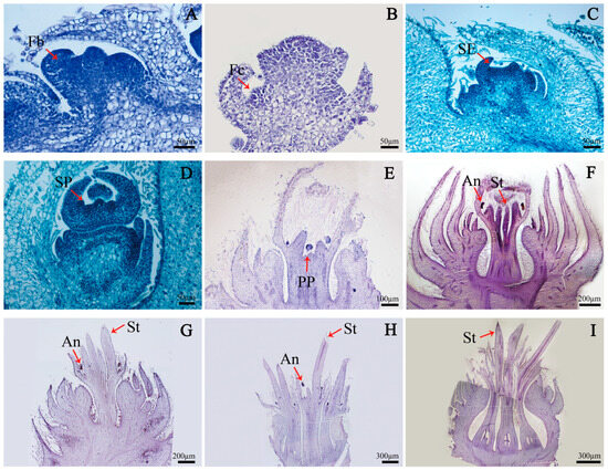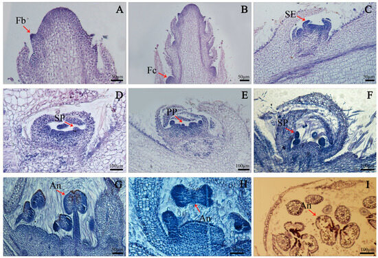 Figure 2. Morphological and cytological observation of the differentiation process of female flowers in Castanea mollissima. (A) Flower-cluster-bract-primordium-differentiation stage; (B) flowe-cluster-primordium-differentiation stage (B0); (C) sepal-primordium-differentiation stage; (D) stamen-primordium-differentiation stage (B1); (E) pistil-primordium-differentiation stage (F1); (F,G) pistil-development stage (F2); (H) flowering stage (F3); (I) ovary-formation stage (F4). An: anther; Fb: flower cluster bract primordium; Fc: flower cluster primordium; SE: sepal primordium; SP: stamen primordium; PP: pistil primordium; St: stigma. (C,D) are stained with Safranine O-fast green, and others are stained with hematoxylin-eosin.