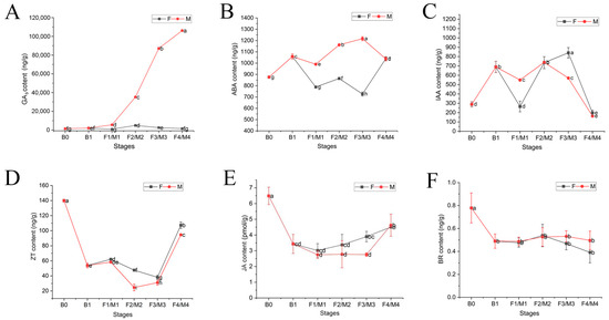 In contrast, the levels of JA and ZT in female flowers were higher than those in male flowers during F1 to F4. Both ZT and JA showed a decreasing trend from B0 to B1 and in F1, but an increasing trend in F3 (Figure 4D,E). The level of IAA showed an M-type trend in both male and female flowers (Figure 4C); however, the level of BR showed no significant differences (Figure 4F).
