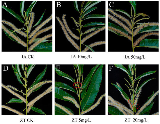 Figure 5. The mixed catkin of Castanea mollissima under different treatments. (A,D) represent the control treatment of jasmonic acid and zeatin, respectively; (B,C) represent the application of 10 mg and 50 mg jasmonic acid, respectively; (E,F) represent the application of 5 mg and 20 mg zeatin, respectively; CK means the control group of treatment with pure water. The axillary female flowers are circled with red circles.