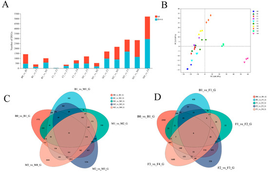 A total of 20,510 differentially expressed genes were found during mixed catkin differentiation, of which 10,302 were upregulated and 10,208 were downregulated. In M4 vs. F4, the most DEGs were discovered, with 2264 upregulated genes and 2950 downregulated genes, respectively, while F1 vs. F2 generated the fewest DEGs (Figure 6A,B). The number of timepoint-specific DEGs in male flowers ranged from 310 (M1 vs. M2) to 3038 (M3 vs. M4), while in female flowers, the number ranged from 77 (F1 vs. F2) to 1868 (B0 vs. B1). Furthermore, throughout the five comparisons, 55 and 6 genes exhibited substantially distinct expression in male and female flowers, respectively (Figure 6C,D).