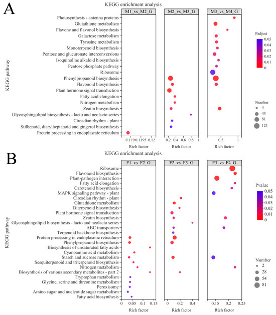 Figure 7. (A) The significant KEGG enrichment pathway of DEGs in male flowers at different developmental stages. (B) The significant KEGG enrichment pathway of DEGs in female flowers at different developmental stages. The area of the bubbles represents the quantity of enriched DEGs, while the color of the bubbles symbolizes the p-adjust and p-value shown in the panel to the right.