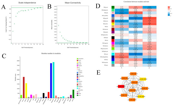 Figure 8. (A) Fitting index R2 of the scale-free network corresponding to different soft thresholds; (B) the average connectivity corresponding to different soft thresholds; (C) the module gene number distribution; and (D) correlation heat map between modules and traits. The data outside the brackets and the data inside the brackets represent the correlation coefficient and p-value among modules and traits, respectively. (E) Core gene co-expression network.