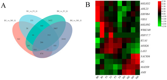 According to the results of WGCNA, transcription factors exhibit an essential role in the differentiation of the female and male flowers of C. mollissima. Based on 266 common DEGs between four comparative groups (Figure 9A), a total of 16 transcription factors related to the differentiation of female and male flowers were excavated. Among the 16 transcription factors, the expression levels of bHLH52, AHL23, ERF084, and VRN1 were downregulated with flower development, while bHLH92, WRKY40, and HSP17.7 were upregulated in the early stages of female flower development. The expression levels of KUA1, MYB26, and LAX1 were significantly high during F1 to F4 and decreased from M1, while NAC056, AG, MADS9, and AMS were highly increased during the male flower stages (Figure 9B).