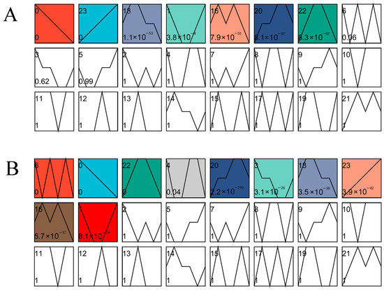 Figure 10. (A) Gene expression profiling of all genes through 6 stages of male flowers. (B) Gene expression profiling of all genes through 6 stages of female flowers. The temporal pattern of profiles with colors is conspicuous, while the temporal pattern of profiles without colors is not conspicuous. The number of the profile is shown in the upper-left corner of the rectangle, the number in the lower-left corner is the p-value, and the trend of expression over time is symbolized by the line.