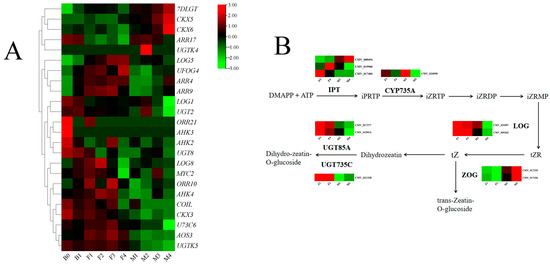 Figure 11. (A) Heatmap of DEGs related to jasmonic acid and zeatin in Castanea mollissima ‘Tanqiao’. Red and green represent up- and downregulated. (B) Heatmap of DEGs related to the zeatin biosynthesis pathway. iPRTP: Isopentenyl-ATP; iZRTP: trans-Zeatin riboside triphosphate; iZRDP: trans-Zeatin riboside triphosphate; iZRMP: trans-Zeatin riboside monophosphate; tZR: trans-Zeatin riboside; tZ: trans-Zeatin.