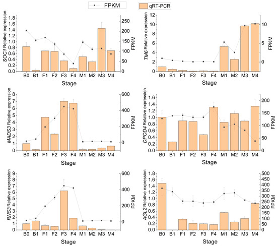 RT-qPCR experiments were performed on the ten samples (B0, B1, F1, F2, F3, F4, M1, M2, M3, and M4) to validate the reliability of the transcriptome data. Thus, we randomly selected six genes in transcriptome data. As shown in Figure 12, the expression patterns of the six genes obtained from RT-qPCR were almost consistent with those from RNA-seq, demonstrating that the RNA-seq results were credible.