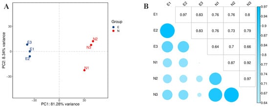 Data analysis of the transcription in the damaged leaves (E) of E. onukii and healthy leaves (N). (A) Principal component analysis (PCA). (B) Pearson correlation between samples.