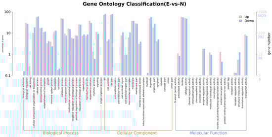 Diagrams of gene ontology database annotations. Note: Pink refers to GO level 2 entries with upregulation of differentially expressed genes, light blue refers to GO level 2 entries with downregulation of differentially expressed genes, the horizontal axis refers to the entry name, and the vertical axis refers to the number and percentage of genes corresponding to the entry.