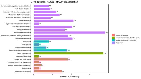 To identify differentially expressed genes (DEGs) in damaged leaves of C. tetracocca, the htseq-count software was used to map the reads of six generated libraries to unigenes, and the expression level was calculated [27]. The gene expressions from each sample were 33,889 (E1), 34,312 (E2), 33,271 (E3), 34,144 (N1), 34,333 (N2), and 34,389 (N3). The adjusted q-value < 0.05 and Log2FC > 1.0 were used as the standard for screening DEGs, and compared to undamaged leaves of C. tetracocca, 8172 genes were differentially expressed (3074 upregulated and 5098 downregulated) upon E. onukii damage.