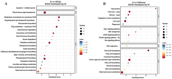 Enrichment bubble diagram of differentially expressed genes of C. tetracocca leaves feeding by E. onukii vs. healthy leaves. (A) The upregulated gene KEGG enrichment pathway and (B) the downregulated gene KEGG enrichment pathway. Note: The Enrichment Score on the horizontal axis in the figure represents the enrichment score. The larger the bubble, the more differential protein-coding genes it contains. The color of the bubble changes from blue to white to yellow to red, and the smaller the enrichment p-value, the greater the significance.