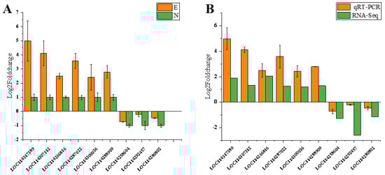(A) Quantitative real-time PCR validation of C. tetracocca leaves feeding by E. onukii and healthy leaves. (B) Quantitative real-time PCR validation of transcriptome sequencing results.