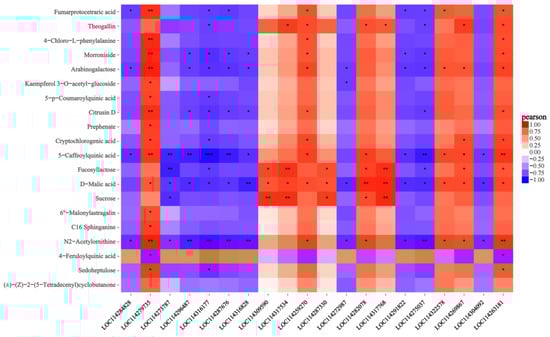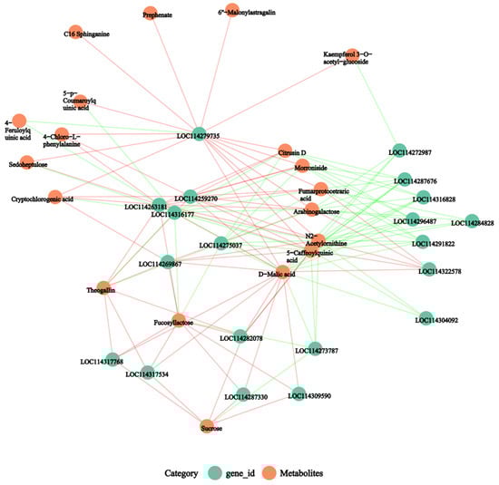 The correlation enrichment heatmaps of the top 20 DEGs and DEMs discovered between the transcriptome and metabolome with the associated correlation coefficient (different colors) are shown in Figure 7. The top 20 DEGs and DEMs with absolute correlation coefficient values larger than 0.5 were filtered in order to create the network diagram with all metabolites since the correlation network diagram placed the genes or metabolites in significantly associated positions (Figure 7). We also plotted the correlation network of the top 20 DEGs and DEMs. N2-acetylornithine had a significant positive correlation with LOC114287676 (DNAJ1) and LOC114275037 (GOS2). The DNAJ1 gene was significantly upregulated and its expression level was approximately five times that of healthy leaves. The GOS2 gene was also significantly upregulated and its expression level was approximately six times that of healthy leaves. D-malic acid has a remarkable effect with LOC114282078. However, LOC114282078 encoding chalcone synthase 2 was significantly downregulated. Seven secondary metabolites, including N2-acetylornithine, D-malic acid, theogallin, fucosyllactose, 5-caffeoylquinic acid, fumarprotocetraric acid, and arabinogalactose, were located at the center of the network and had a significant correlation with genes (Figure 8).