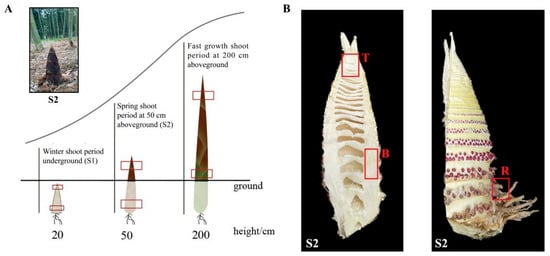 Schematic diagram of sampling stages and tissue sites of Moso bamboo shoots. (A) Stages of Moso bamboo rhizome buds were characterized by the bud or shoot length: winter shoot period underground (S1), spring shoot period at 50 cm aboveground (S2), and fast growth shoot period at 200 cm aboveground (S3). The red boxes show where the shoots were sampled. (B) Shoot tip biogenic tissue (T), shoot base mature tissue (B), and shoot root (R).