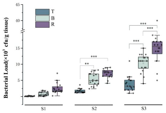 The endophyte loads were observed from 0.1 × 103 to 4.36 × 104 cfu/g in the tip tissues of Moso bamboo shoots on different media; however, the endophyte loads varied from 0.64 × 103 to 1.68 × 104 cfu/g in their basal and root parts (Figure 2). The R2A medium was found to be more suitable for deciphering the maximum endophytic bacterial diversity compared to LB (Table S1). The total amount of endophytes in roots and basal was always significantly higher than that in apices in the period of S1, S2, and S3, and for different tissue parts, the endophyte loads were always elevated with the growth stages (Figure 2).