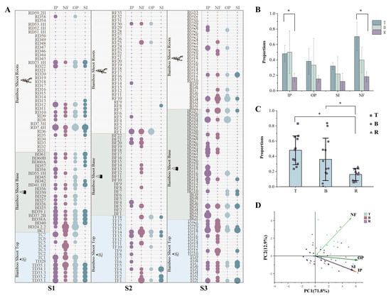 Isolation of endophytic bacteria from tissues of different sites at three stages showed that the highest endophytic bacterial loads were found in the roots of mauve bamboo shoots, followed by the bases, and the lowest in the tips at all growth stages. In contrast, the proportion of PGPB in the flora was highest at the tip, followed by the base, and lowest at the tip. In other words, the microbial community structure in the tips of Moso bamboo shoots was dominated by PGPB. Regarding the different biohabitats and colonization pathways in roots, culms, and leaves that could explain the differences in endophyte abundance and community structure, this has been observed in crops such as cotton [], potato [], maize [], and rice [].