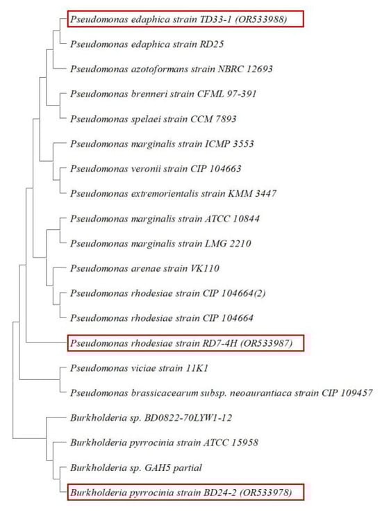 Identification of endophytic bacteria was performed based on 16S rRNA gene sequences. Prior to genomic DNA extraction, the strains were inoculated in an LB medium and incubated for 24 h at 28 °C with shaking (180 rpm). Using universal primers 27F (forward) 5′-AGAGTT TGATCATGCTCAG-3′ and 1492R (reverse) 5′-GGT ACCTTGTTACGACTT-3′ on the 16S rRNA gene sequences (approximately 1500 base pairs) were amplified via PCR. The PCR products were then visualized using electrophoresis, purified using kits from TransGen Biotech Co., Ltd. (Beijing, China), and sent to DynaPro Biotech (Wuhan, China) for DNA sequencing. Homologous DNA sequences were retrieved and analyzed using the BLAST algorithm. For the assignment of taxonomic affiliation at the species level, 16S rRNA gene sequences with greater than 99% identity to a particular bacterial species were sufficient to give the strain a tentative scientific name. In contrast, sequences with greater than 99% identity to two or more bacterial species or less than 99% identity to two or more bacterial species represented unidentified species designated as genus plus “sp”. All sequences are available at the GenBank under the accession numbers OR533977 to OR533996. The final identification of bacterial strains was based on a neighbor-joining phylogenetic tree of bacterial 16S rRNA gene sequences created by the software MEGA (v.11.0.13, Mega Limited, Auckland, New Zealand).