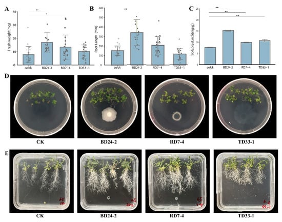 Images and analysis of growth-promoting conditions using selected growth-promoting bacteria co-cultured with Arabidopsis. (A) Comparison of fresh weights of Arabidopsis seedlings cultured horizontally with 30 replicates for each treatment. (B) Comparison of primary root length of horizontally cultured Arabidopsis seedlings. (C) The soluble sugar content of aboveground parts of horizontally cultured Arabidopsis seedlings. (D) Horizontally cultured Arabidopsis seedlings. (E) Vertically cultured Arabidopsis seedlings. Significance was calculated using Tukey’s test (* p > 0.05, ** p > 0.01).