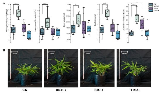 Images and analysis of growth parameters of Moso bamboo inoculated with selected growth-promoting bacteria. Significance was calculated using Tukey’s test (* p > 0.05, ** p > 0.01, *** p > 0.001).