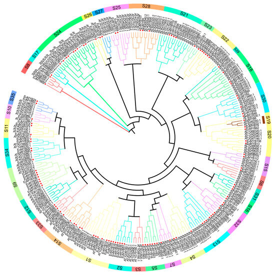 To investigate the phylogenetic relationships of the EuMYB gene family, a phylogenetic tree was generated based on the EuMYB protein sequences (Supplementary Table S2) and Arabidopsis MYB protein sequences (Supplementary Table S3). Based on the classification principles of the MYB subfamilies and the model plant Arabidopsis thaliana, they could be divided into 35 subfamilies (Figure 1). Among them, the MYB family members of E. ulmoides were distributed in 34 of the 35 subfamilies in the evolutionary tree, with no EuMYB family members in the S12 subfamily. The S6, S10, S17, S19, S27, and S29 subfamilies contained only one EuMYB member, while the S24 subfamily contained nine EuMYB members. These findings indicated that the MYB genes of E. ulmoides and Arabidopsis thaliana had undergone specific expansion and differentiation during evolution.