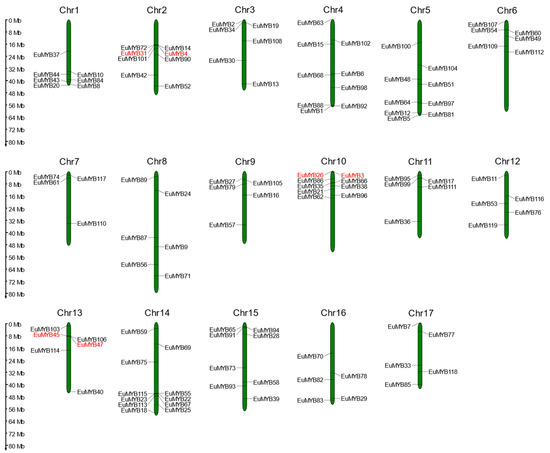 Chromosomal location of EuMYB genes. The chromosomal position was mapped according to the E. ulmoides genome. Only 115 EuMYB genes (not including EuMYB41, EuMYB46, EuMYB50, and EuMYB80) were mapped to the 17 chromosomes of E. ulmoides. Three pairs of tandem repeat genes are marked in red in the figure.