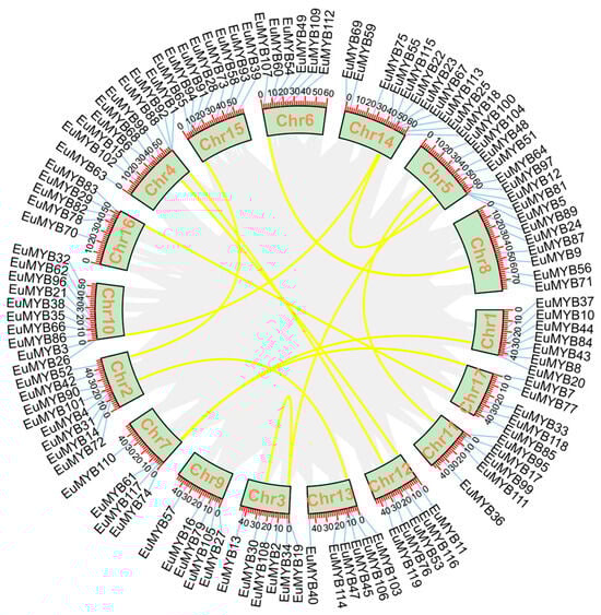 Collinearity analyses of the MYB gene family in E. ulmoides. The yellow line represents EuMYB fragment repeat members.